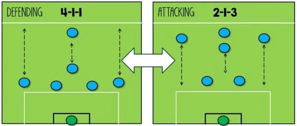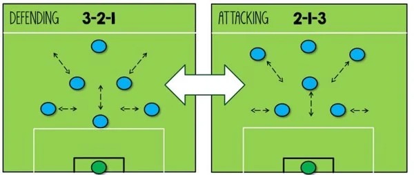 Hình ảnh trên chỉ rõ cách làm thế nào đội bóng áp dụng một đội hình thiên về phòng ngự khi phòng thủ và sử dụng một đội hình thiên về tấn công khi bóng đang tiến lên phía trước. Như trong hình này, khi đội bóng đang phòng thủ, họ chơi 3 cầu thủ phía dưới với 2 tiền vệ trung tâm.